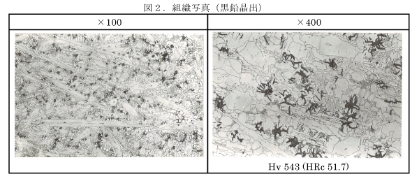ターカロイ鋳鉄は摺動部の耐摩耗性に優れ、広く使用されています。普通鋳鉄の組成では冷却速度が大きくなるとFe-Fe3C共晶で凝固するため黒鉛が生じませんが、高炭素、高シリコンの組成にすると冷却速度がかなり大きくても安定系のFe-Graphite共晶で凝固します。このスーパーハードロイ材料は、高炭素、高シリコンで冷却速度が大きいPTA肉盛法により、2層盛において黒鉛を適量晶出させた肉盛層が得られることが特徴となっています。黒鉛の晶出は、固体潤滑として作用し、摺動部分の耐磨耗性及び耐焼付性効果が向上します。